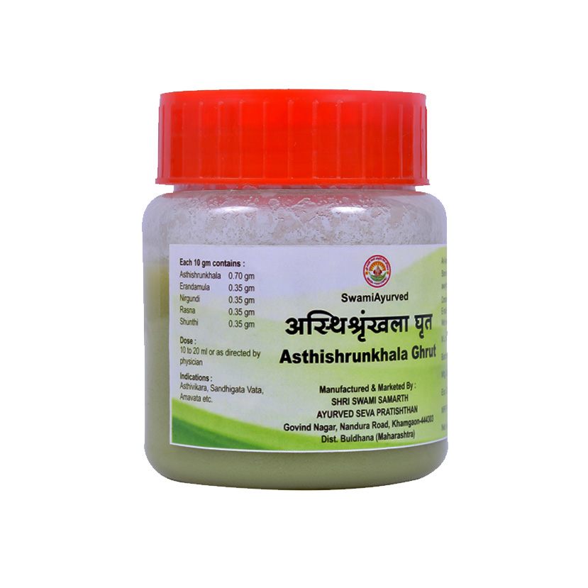 Asthikhunkhala Ghrutam is our proprietary Ayurvedic medicine having Asthishrunkhala as chief ingredient and Erandamula, Rasna, Nirgundi and Shunthi as co-ingredients in it. It is mainly useful in all rheumatlogical disorders such as Sandhigata Vata (osteoarthritis), Amvata (Rheumatoid arthritis), Vatakantaka (Planter fasciitis), Vatarakta (psoriatic arthritis, gout like diseases). It is also useful in hair disorders like hair fall, dandruff, split hairs. It promotes the growth of hairs. It is also useful in fractures of bone. It can be used in avascular necrosis like diseases for a longer time. Age related & post-menopausal osteoporosis is well managed with Asthishunkhala Ghrutam.