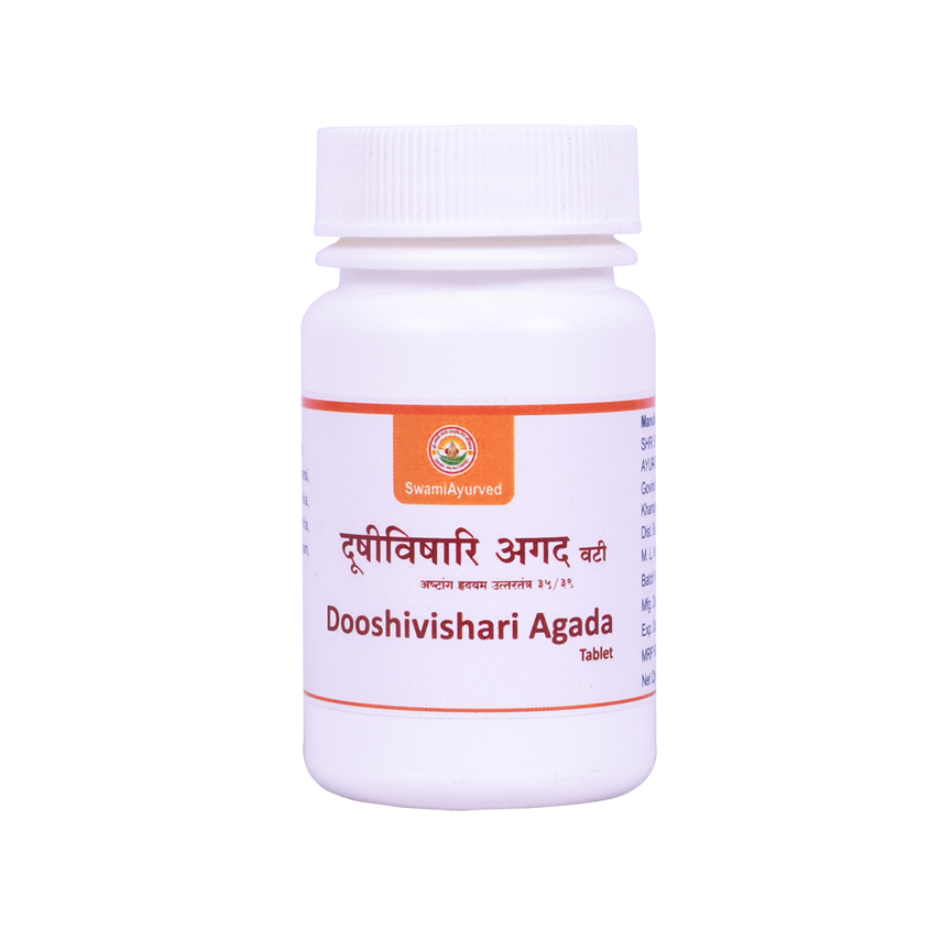 Dooshivishari Agad is a classical Ayurvedic formulation cited in Ashtag Hruday Uttarsthana 35/39. It contains Pippali (Piper longum), Dhyamaka(Cymbopogon martinii), Jatamansi (Nardostachys jatamansi), Lodhra (Symplocos racemosa), Ela (Elettaria cardamomum), Suvarchika (Salt peter), Kutannata (Cyperus rotundus), Tagar (Valeriana wallichii), Kushtha (Saussurea lappa), Yashtimadhu (Glycyrrhiza glabra), Chandan (Santalam album) & Gairika. It is available in tablet form. It is highly useful in dormant & cumulative poisoning & its complications.