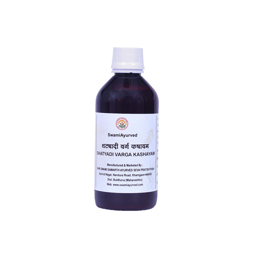 Shatyadi Varga Kashayam is a classical medicine cited by Acharya Charak in Jwara Chikitsa 3/211. The ingredients of Shatyadi Varga Kashayam are Shati (Hedychium spicatum), Pushkaramoola (Inula racemosa), Vyagri (Solanum xanthocarpum), Duralabha (Fagonia cretica), Guduchi (Tinospora cordifolia), Nagar/Shunthi (Zingiber officinale), Patha (Cissampelos pareira), Kiratatikta (Swertia chirayita), Katurohini (Picrorhiza kurroa).