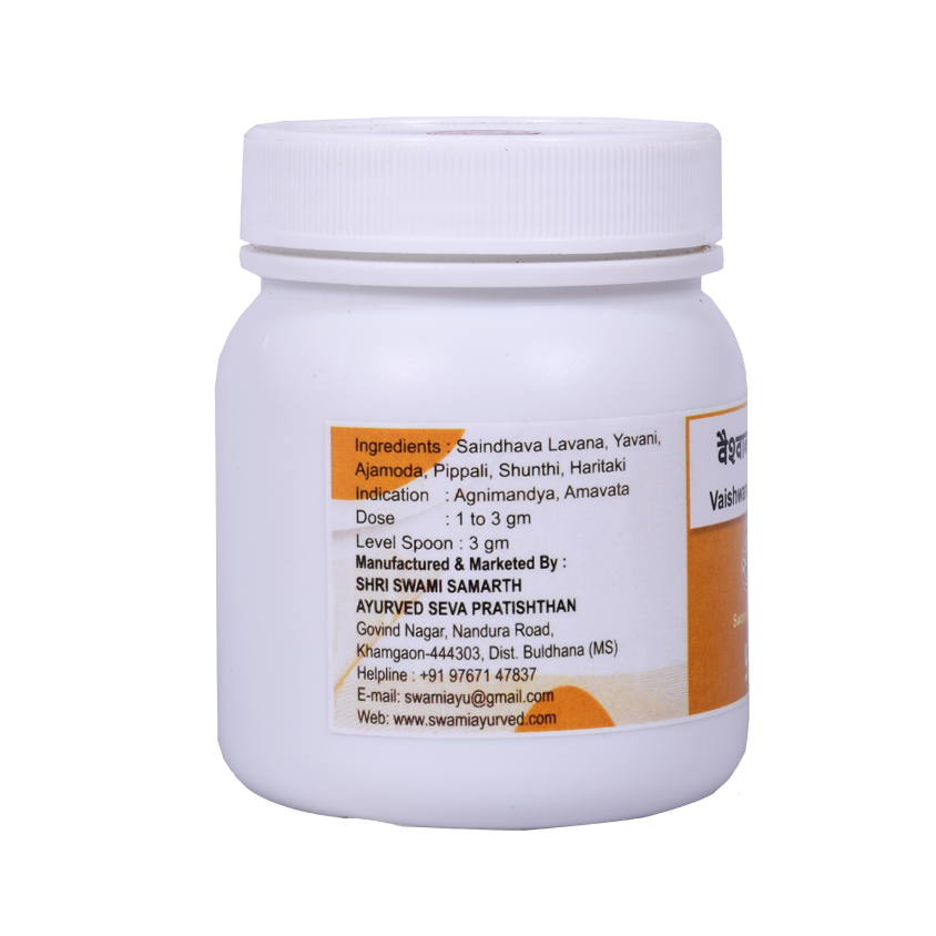 SwamiAyurved Vaishwanara Churna is a Classical Product manufactured by Shri Swami Samarth Ayurved Seva Pratishthan i.e. SwamiAyurved. It contains Sanidhava Lavana, Yavani, Ajmoda, Pippali, Shunthi & Haritaki. It is best formulation for promoting Agni. Hence it is drug of choice in all types of Agnimandya. It is best Amapachaka, hence it is used in Amavata (Rheumatoid arthritis) for digesting Ama. The use of Vaishwanara Churna relieves the pain & inflammation in Amavata very quickly. Once the painless condition is achieved, its dose or frequency must be reduced otherwise it may cause weight loss with the help of other drugs administered in Amvata.